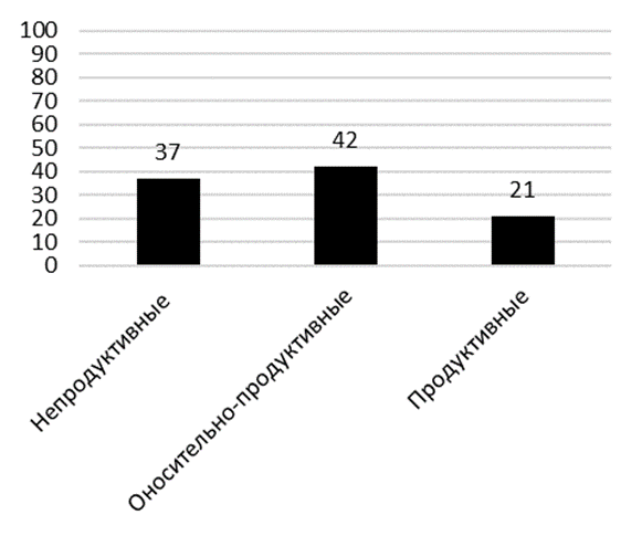 В ходе анализа результатов исследования стратегий поведения подростков, полученных при использовании психодиагностической методики определения индивидуальных копинг-стратегий Э. Хайма, было выявлено распределение испытуемых по степени предпочтительности каждой из представленных групп копинг-стратегий (продуктивные, относительно продуктивные, непродуктивные) (рисунок 1).