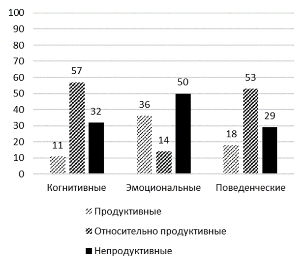 Также в рамках исследования было выявлено распределение непродуктивных копинг-стратегий в каждой из групп (когнитивных, эмоциональных, поведенческих). Данные представлены в таблице 1.
