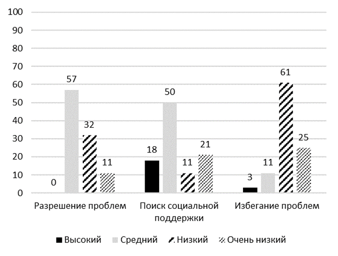 Около половины опрошенных используют конструктивные копинг-стратегии «разрешение проблем» и «поиск социальной поддержки» на среднем и низком уровне, редко используют стратегии «самоконтроль», «принятие ответственности», «планирование решения проблем». Выраженное предпочтение неконструктивных форм поведения продемонстрировали: 14 % подростков – «конфронтационный копинг», 14 % – «дистанцирование», 18 % – «бегство-избегание».