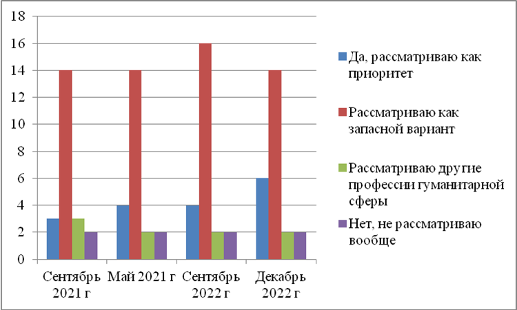 Ответы обучающихся класса психолого-педагогической направленности стабильны в течение всего рассматриваемого времени. Исследование позволяет сделать вывод о том, что большинство обучающихся рассматривают возможность поступления на педагогические специальности (81%). При этом выросла доля тех, кто рассматривает поступление в педагогический ВУЗ как приоритетное направление (с 12 до 20%), что позволяет сделать вывод об эффективности реализации программы, о готовности учащихся в будущем заниматься педагогической деятельностью.